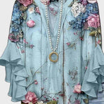 Sini™ | -vaaleansininen paita huokuu raikkautta ja naisellisuutta modernissa muodissa, jossa arvostetaan ajattoman eleganssin tuntua. Vaaleansininen pohja korostaa kukkakuosia vaaleanpunaisissa, lilan ja valkoisissa sävyissä, luoden hienostuneen ja tyylikkään kokonaisuuden. Pienet käsityöerät ja huolellisesti valitut materiaalit varmistavat pitkän käyttöiän ja jatkuvan merkityksen vaatekaapissa.