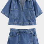 Tämä denim-setti on harkittu yhdistelmä klassista muotoilua ja modernia keveyttä. Laadukas premium-denim tuntuu miellyttävältä päällä ja säilyttää ryhtinsä käytössä, kun taas selkeä leikkaus luo huolitellun mutta rennon kokonaisuuden. Lyhyt takki ja minimalistinen yläosa muodostavat tasapainoisen ilmeen, joka toimii arjessa ja huolitelluissa tilanteissa.