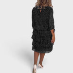 Alisa huokuu puhdasta eleganssia hienostuneen pilkkukuosinsa ansiosta. Kolmivartiset hihat ja pyöreä pääntie luovat klassisen ilmeen, kun taas kerrostettu leikkaus muotoilee siluetin kauniisti ja antaa asulle kevyttä liikettä. Tämä mekko on täydellinen valinta, kun haluat yhdistää tyylikkyyden ja vaivattoman mukavuuden.