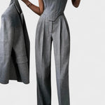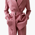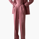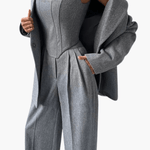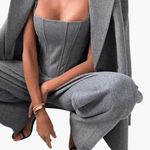 Signe on ylellinen ja voimakas setti, jossa hienostunut muotoilu kohtaa huolellisen käsityön. Rakenteellinen korsettimainen yläosa ja räätälöidyt housut luovat vahvan mutta naisellisen siluetin, joka huokuu itsevarmuutta ja eleganssia. Tarkasti suunnitellut leikkaukset korostavat vartaloa luonnollisesti, samalla kun laadukkaat materiaalit takaavat mukavuuden ja kestävyyden. Signe on suunniteltu erottumaan – täydellinen valinta iltatilaisuuksiin, juhliin ja hetkiin, joissa tyyli on keskiössä.