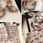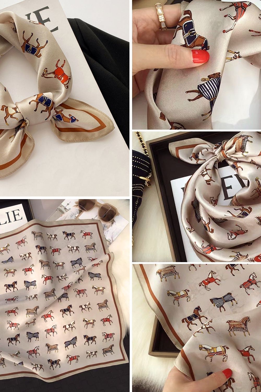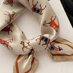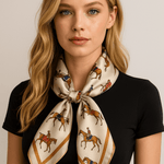 Maarit™ | Silkkisjaali rikastuttaa tyyliäsi 100 % puhtaalla silkillä ja ylellisellä, kiiltävällä pinnalla. Elegantti hevosaiheinen kuosi tuo ajattoman ilmeen, joka sopii sekä juhlatilaisuuksiin että huoliteltuun arkityyliin. 53 × 53 cm koko mahdollistaa kauniin laskeutuvuuden ja tekee huivista hienostuneen statement-asusteen. Sesonkikokoelman rajattu saatavuus tekee Maaritista sijoituksen eleganssiin – klassikon, joka säilyttää arvonsa vuodesta toiseen.