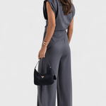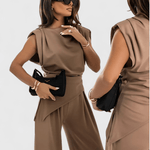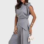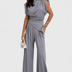 Tämä hienostunut setti yhdistää veistoksellisen siluetin ja ajattoman modernin ilmeen. Epäsymmetrinen yläosa ja leveälahkeiset housut luovat tasapainoisen kokonaisuuden, joka huokuu itsevarmuutta ja hienostuneisuutta. Kevyesti hohtava kangas liikkuu kauniisti ja tuntuu miellyttävältä päällä, tehden setistä täydellisen valinnan sekä juhlahetkiin että tyylikkääseen arkeen.
